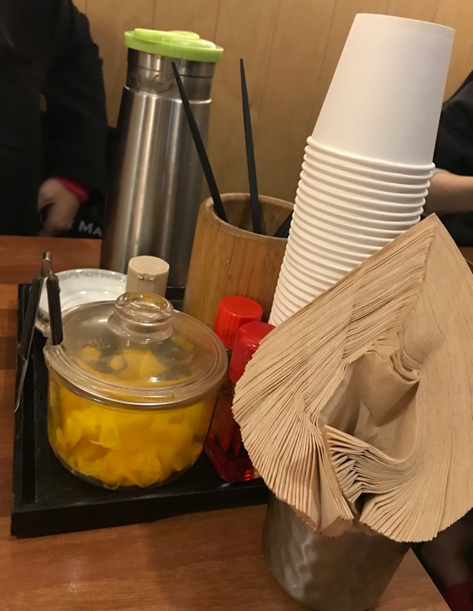 기본적으로 티슈와 소스, 단무지 그리고 물이 세팅되어있다.