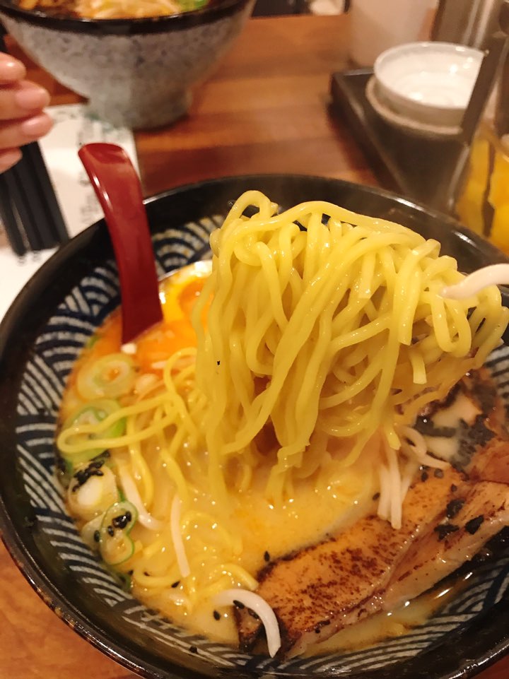 국물을 처음 떠먹었을 땐 매콤한 느낌이 확 드는데, 첫 입에만 그렇게 느껴지고 계속 먹다 보면 맵다는 느낌은 잘 들지 않는다. 라멘 국물 맛도 굉장히 깊고 진하고 고소한 맛이 확 느껴진다.
