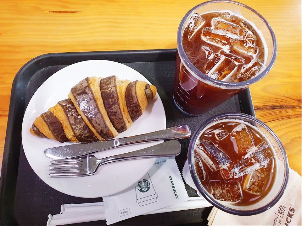 그래서 전 아이스 아메리카노 두 잔과 초코 크로와상 하나를 시켰습니다.