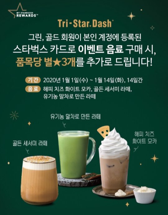 골든 세서미 라떼, 유기동 말차로 만든 라떼 그리고 해피 치즈 화이트 모카 이렇게 세 가지로 나왔어요.