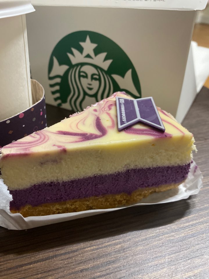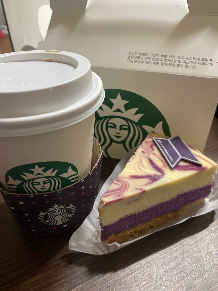 그래서 저는 따뜻한 아메리카노와 퍼플 베리 치즈케이크를 사 왔어요.