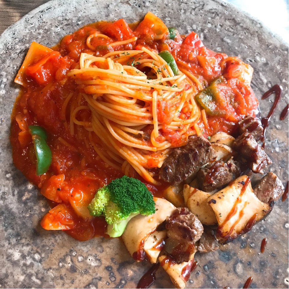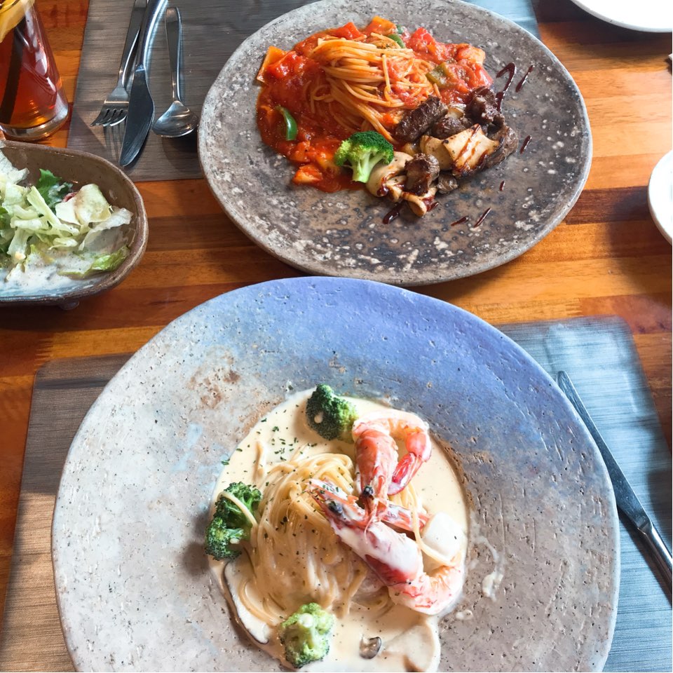 파스타 그릇이 참 예쁘고 분위기 있어요.