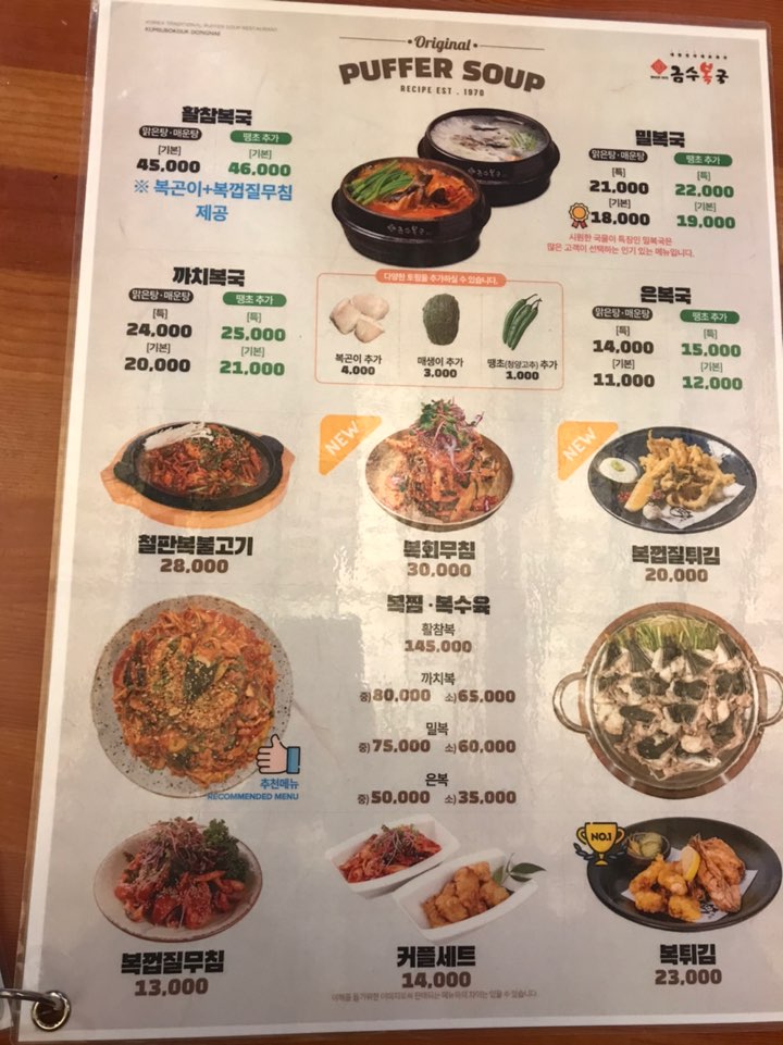 금수복국의 메뉴판입니다.