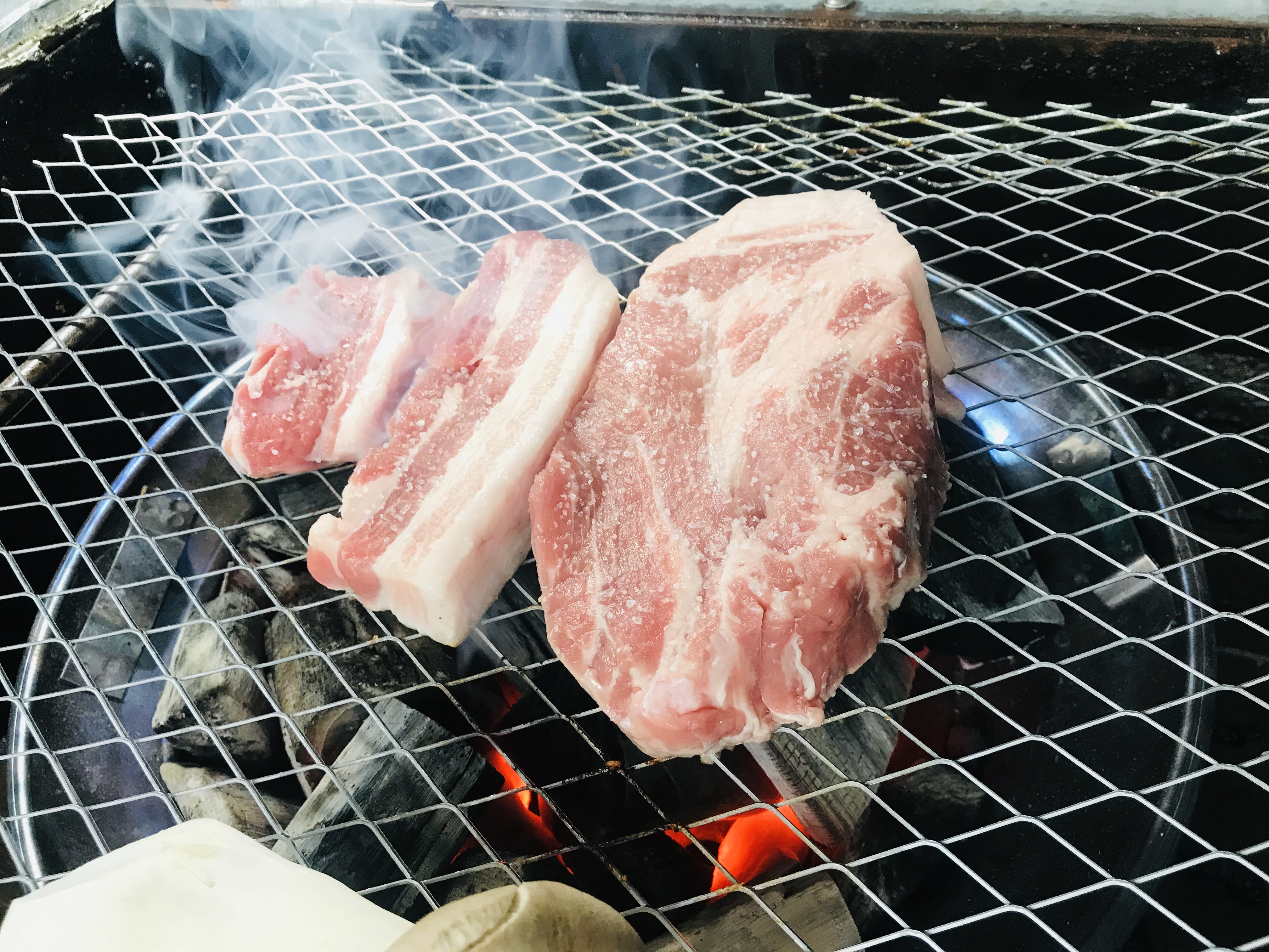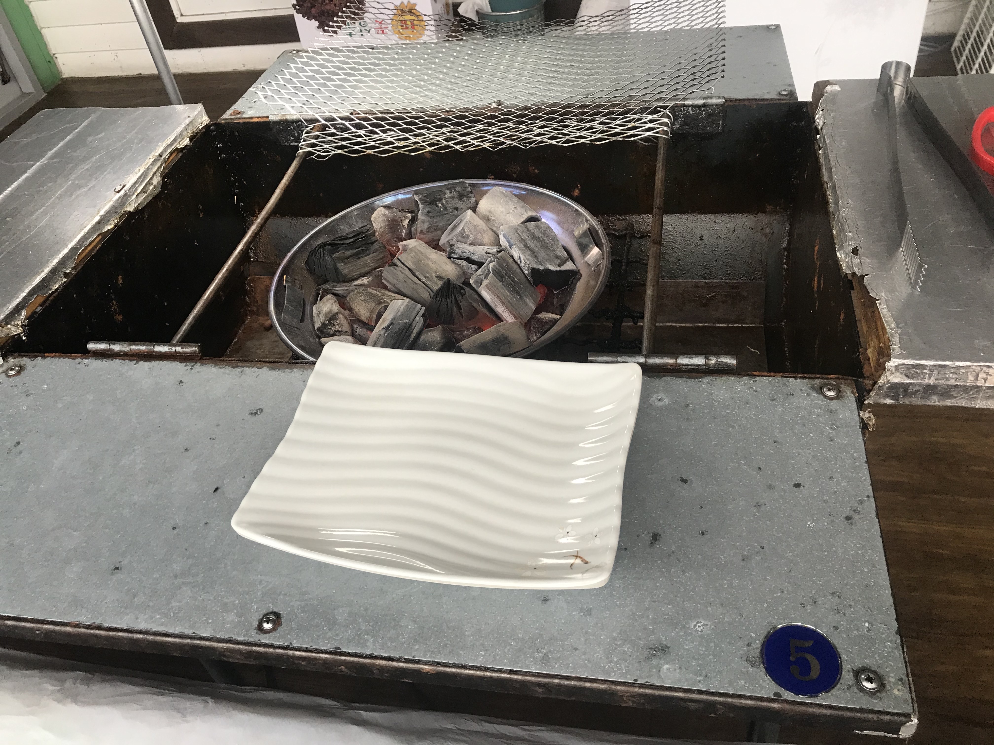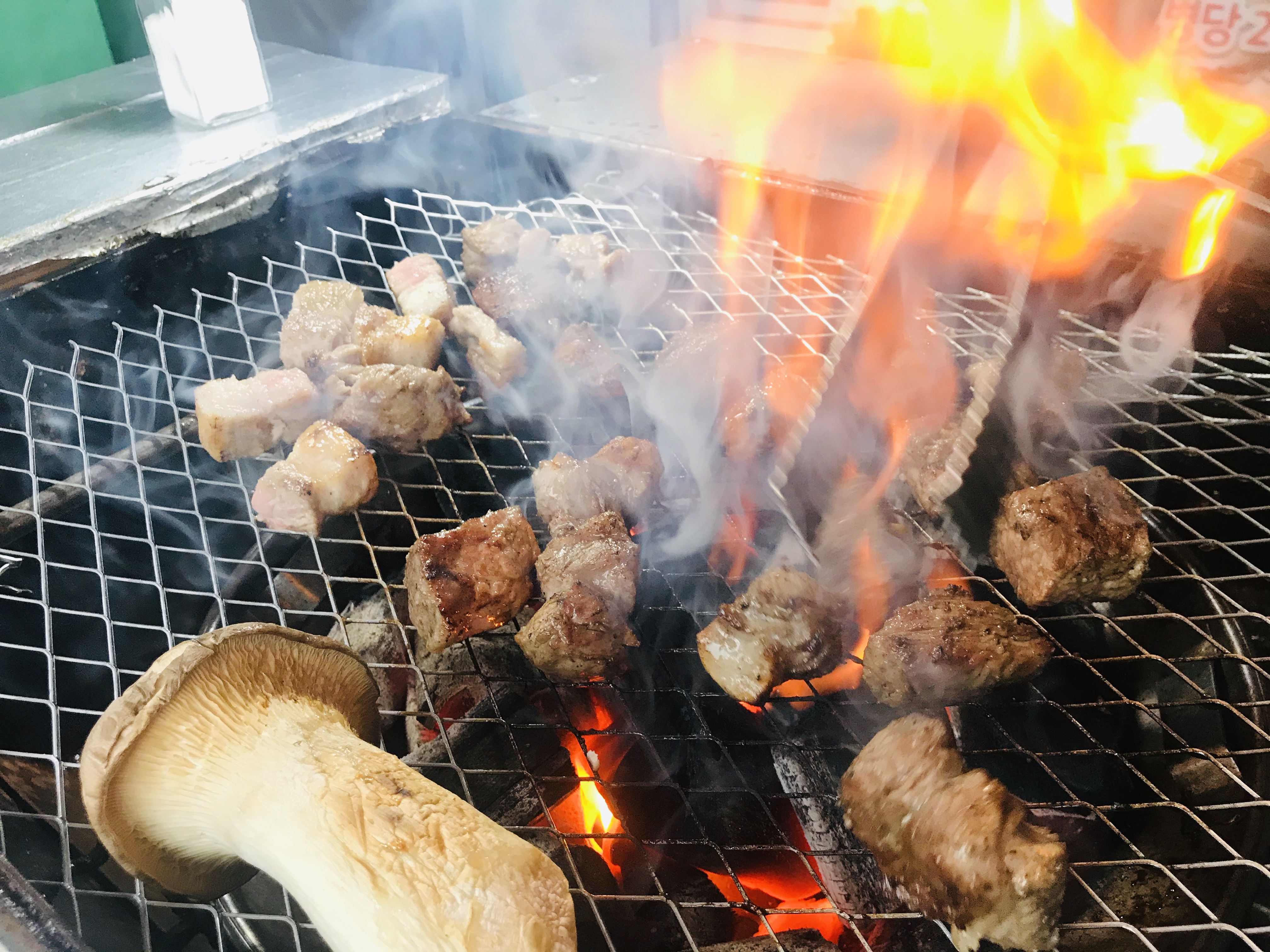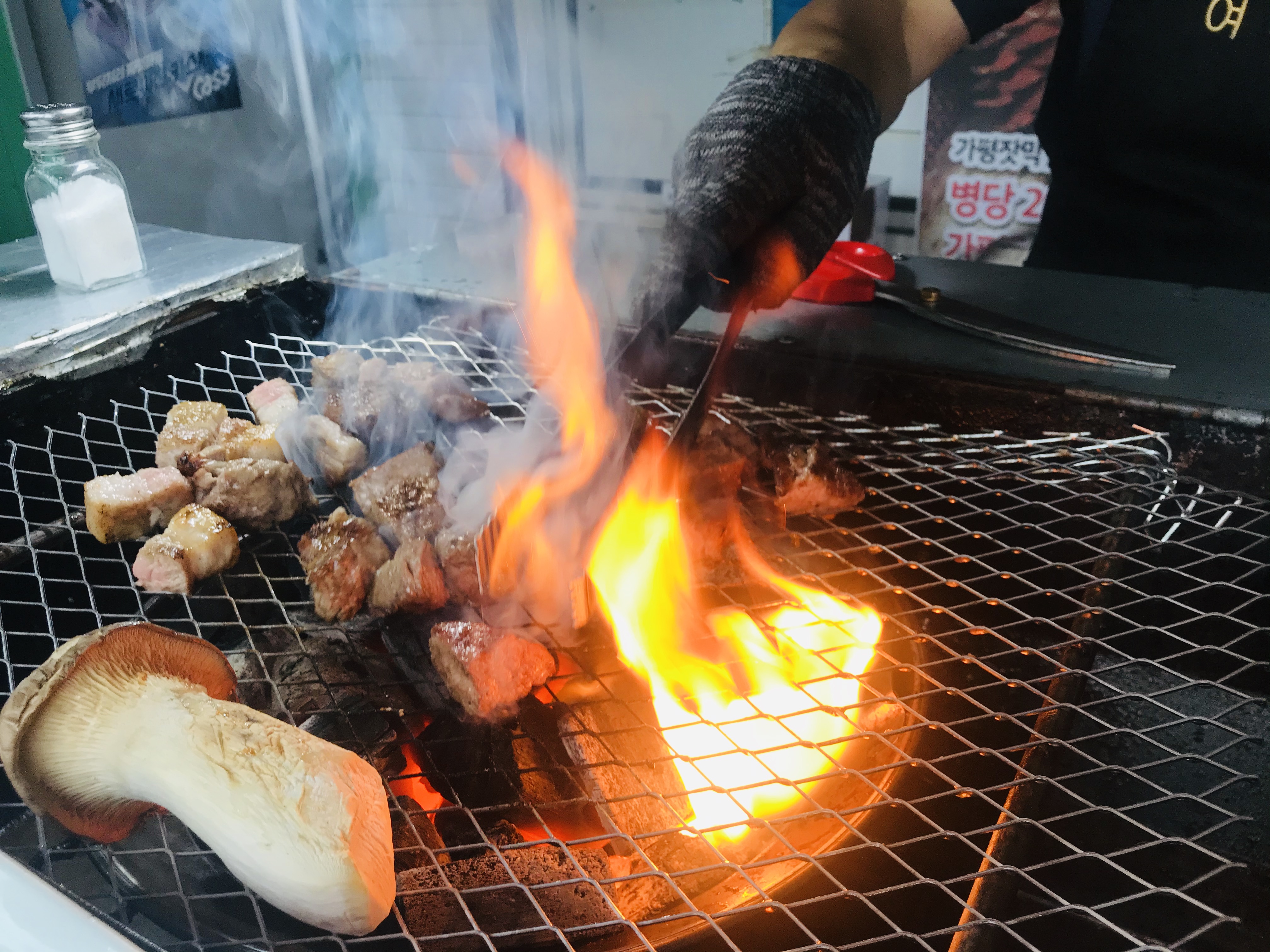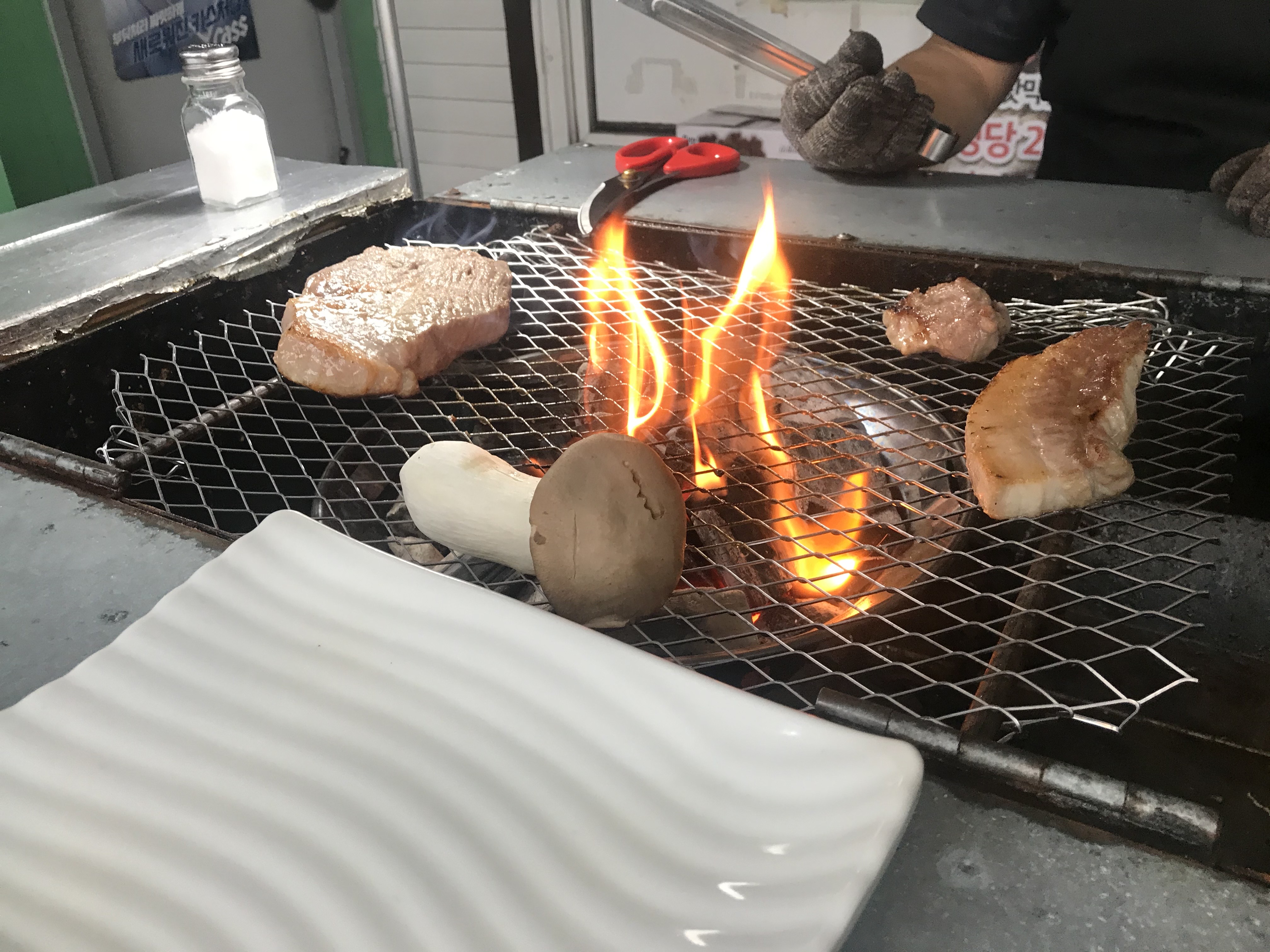 아무튼, 저렇게 불이 확 오르면 어떤 손님들은 저게 바로 불맛이다! 하고 고기를 구워버리는데 그러면 고기가 겉에만 바로 타버린다고 해요.