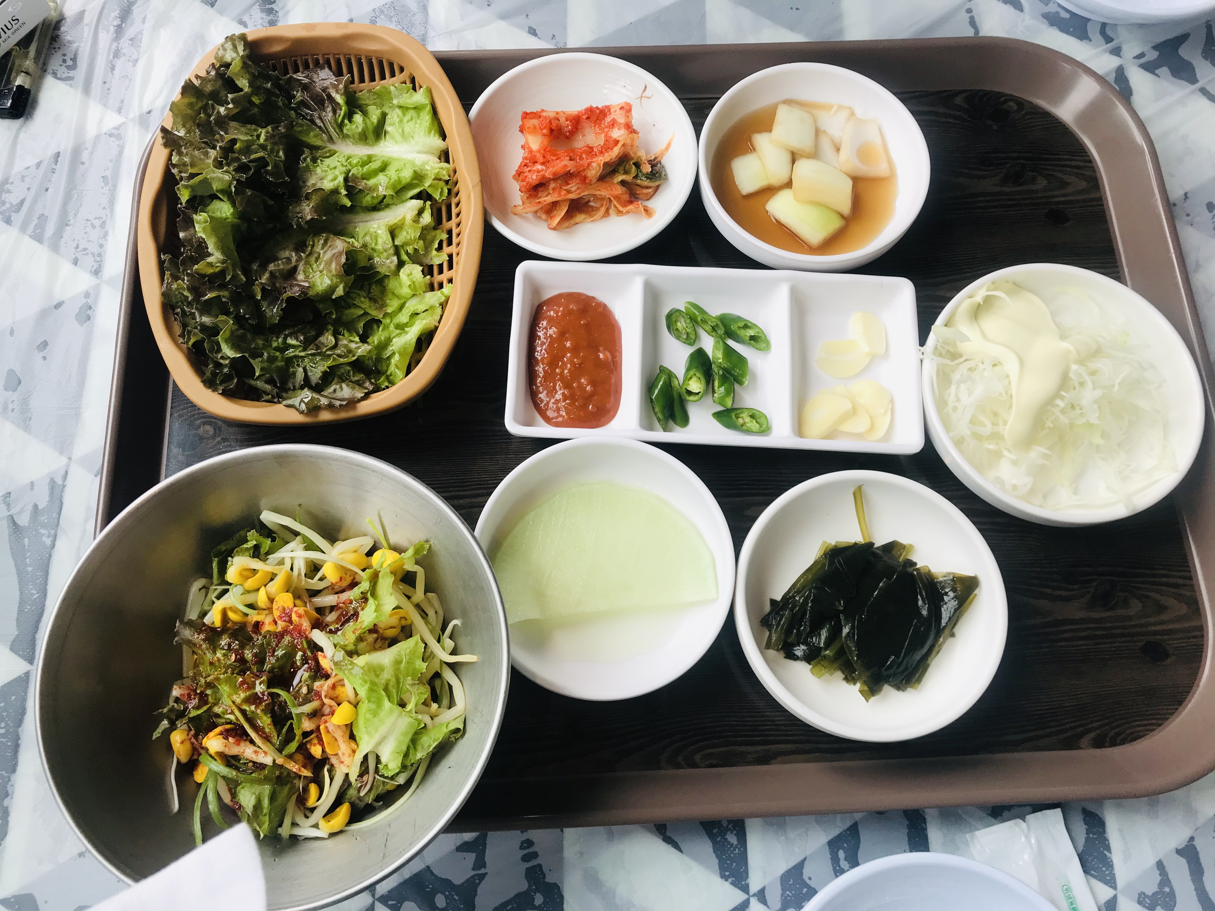 쌍추, 콩나물 무침, 쌈무, 명이나물, 샐러드, 양파 장아찌, 김치 고추 마늘 쌈장이 구성되어있고,