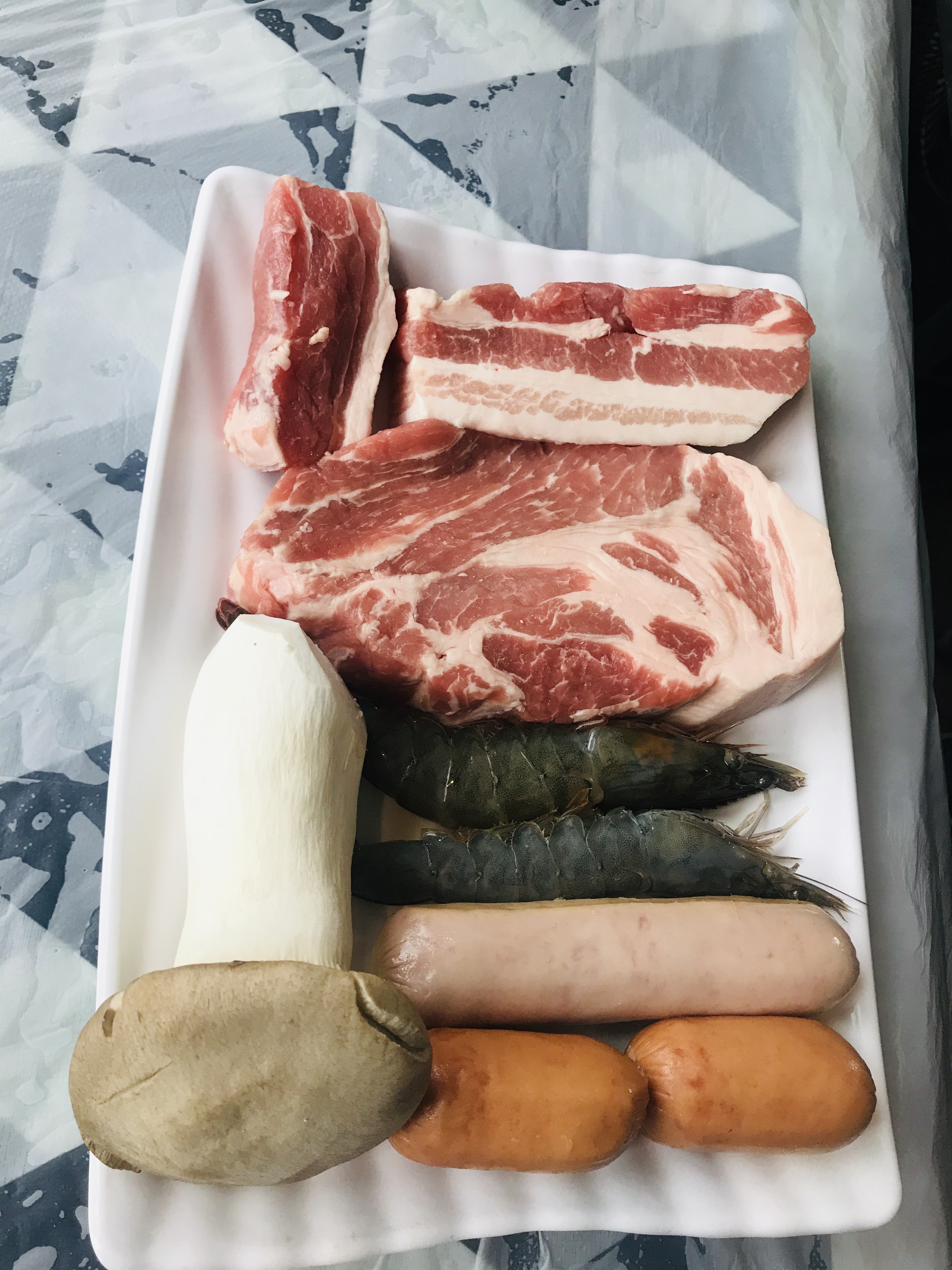 생목살, 생삼겹살, 버섯, 블랙타이거, 수제 소시지 2종이 이렇게 나왔어요.