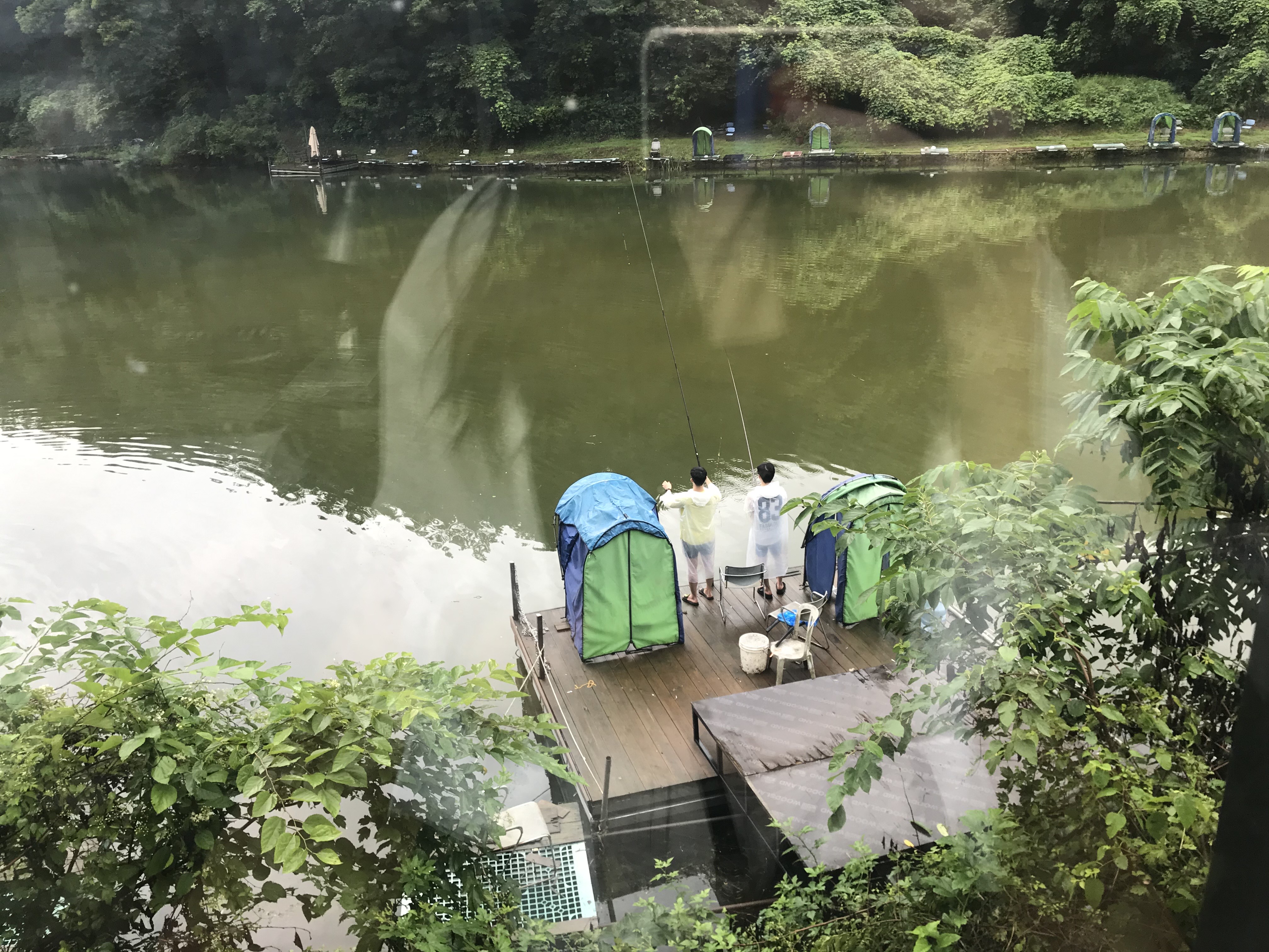 식당 안에 들어가서도 이렇게 저수지의 뷰가 보여요. 사람들이 낚시를 열심히 하네요.