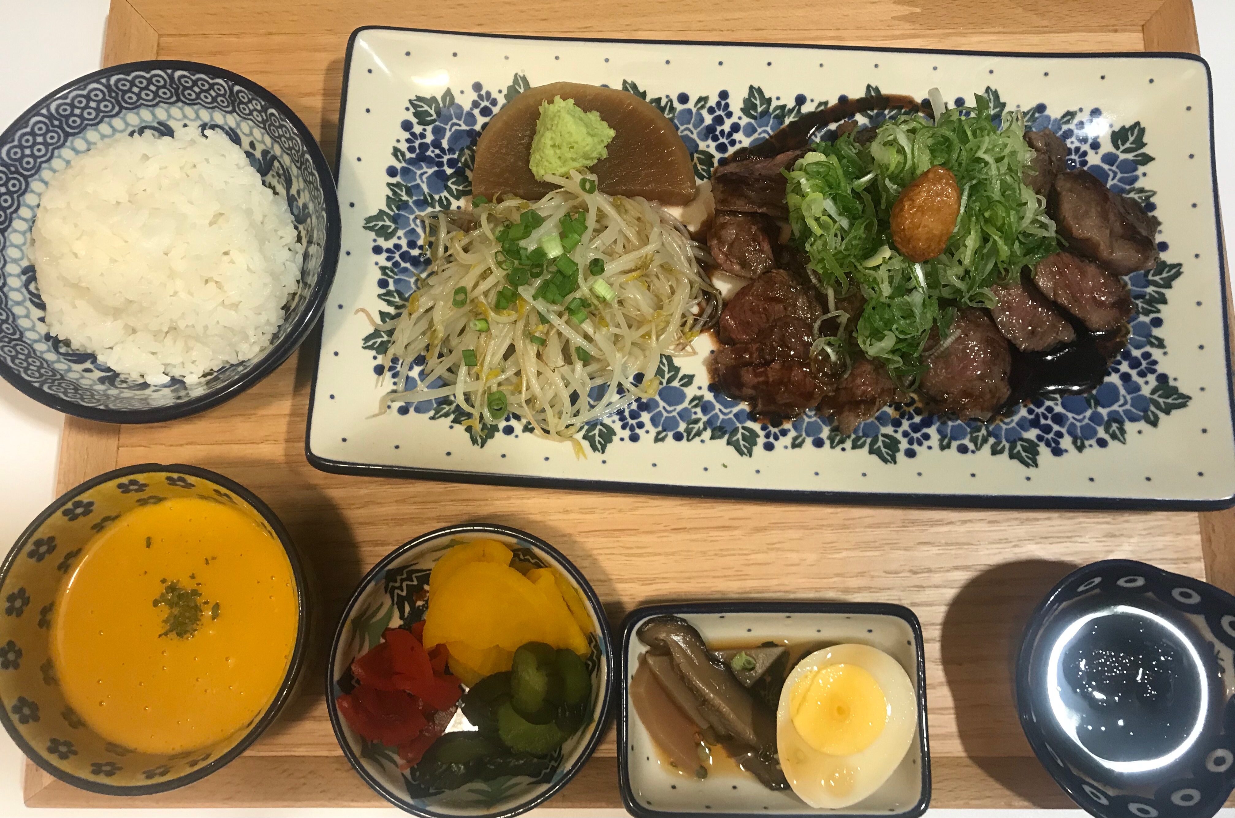 기본적으로 밥과 스테이크, 단호박, 달걀 장조림이 나와요.