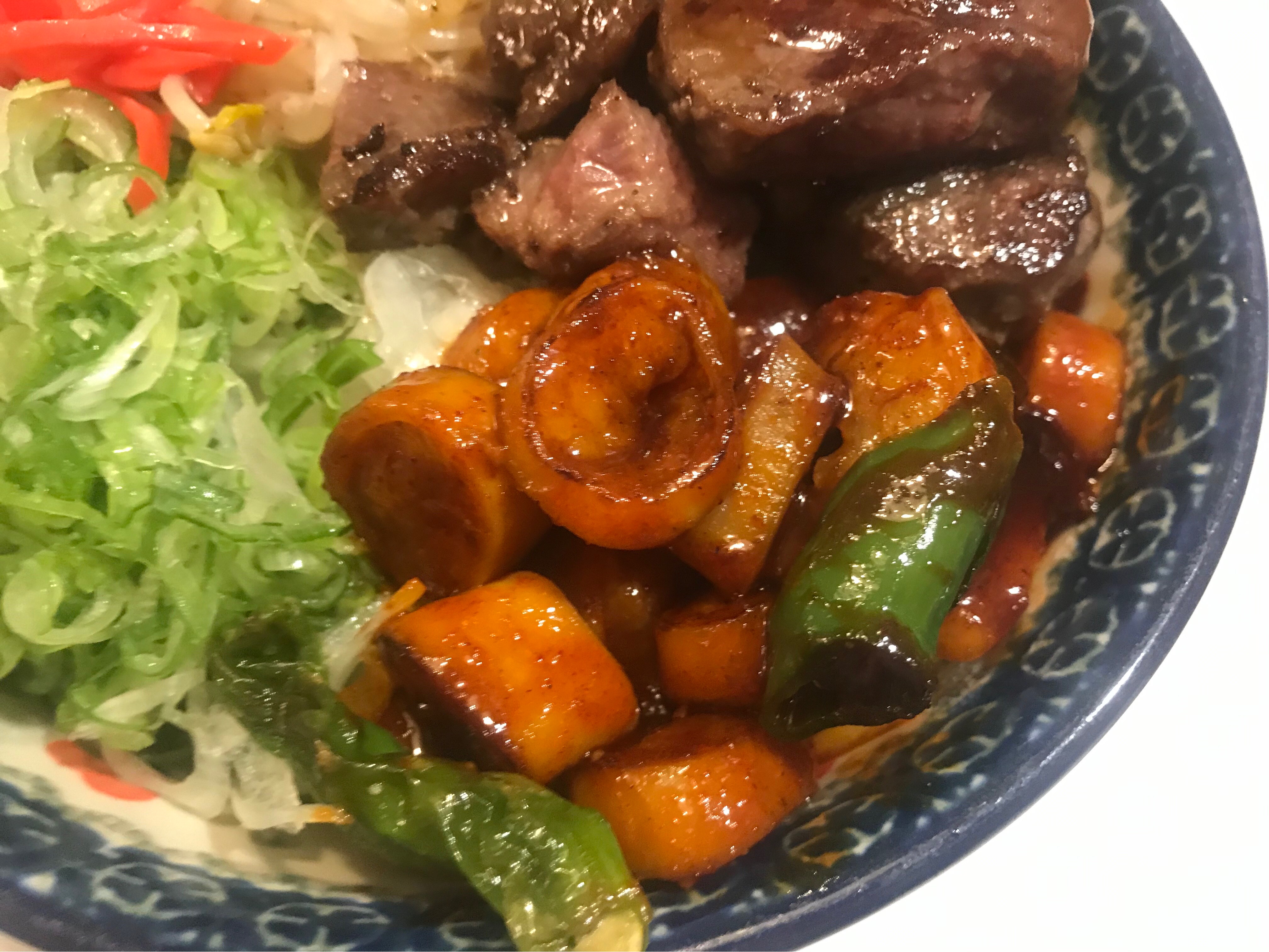 이것은 제가 너무나도 먹어보고 싶었던 대창 큐브 스테이크 덮밥입니다.