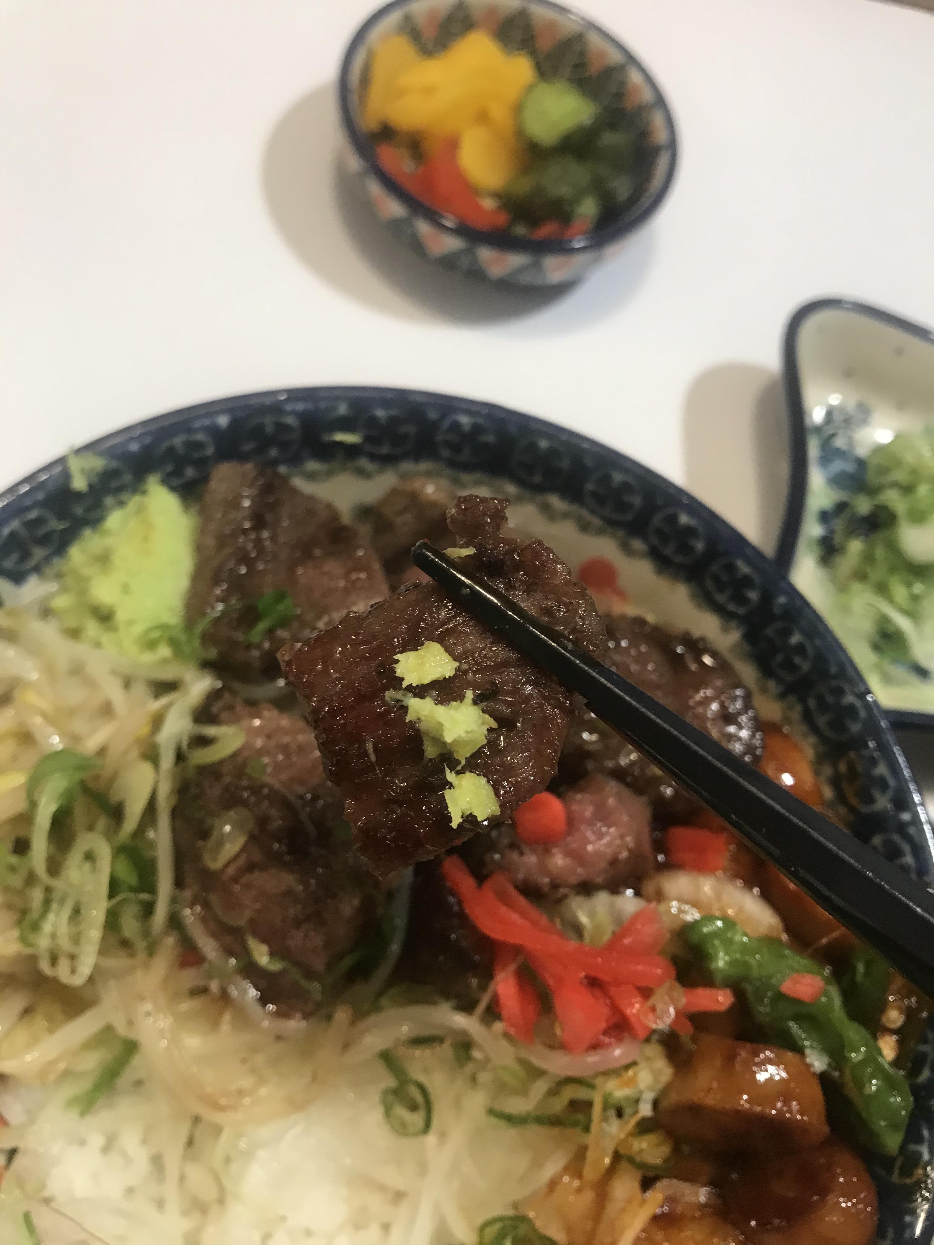 이것은 덮밥 위에 올려져 있는 큐브 스테이크입니다.
