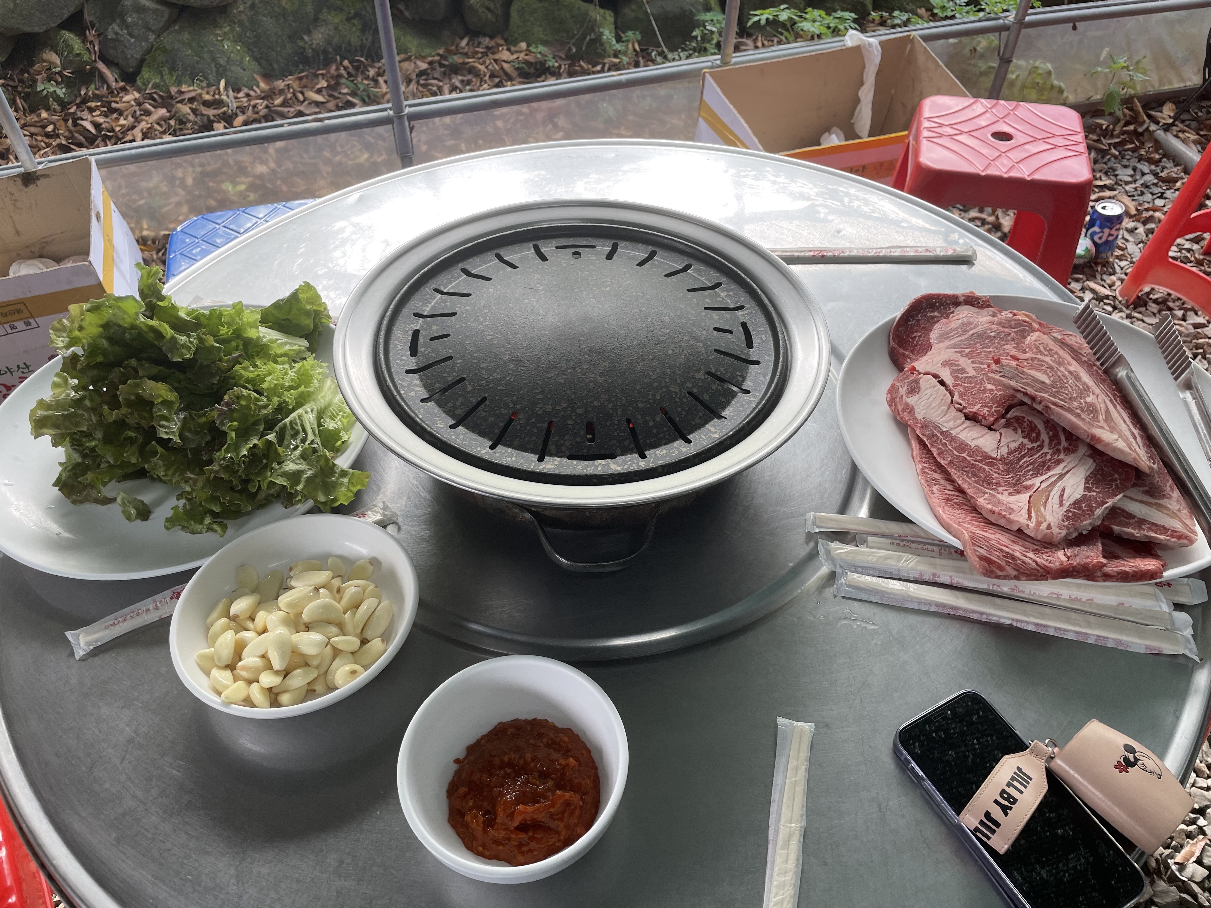 불판만 놓아주시고, 고기 가져오는 것부터