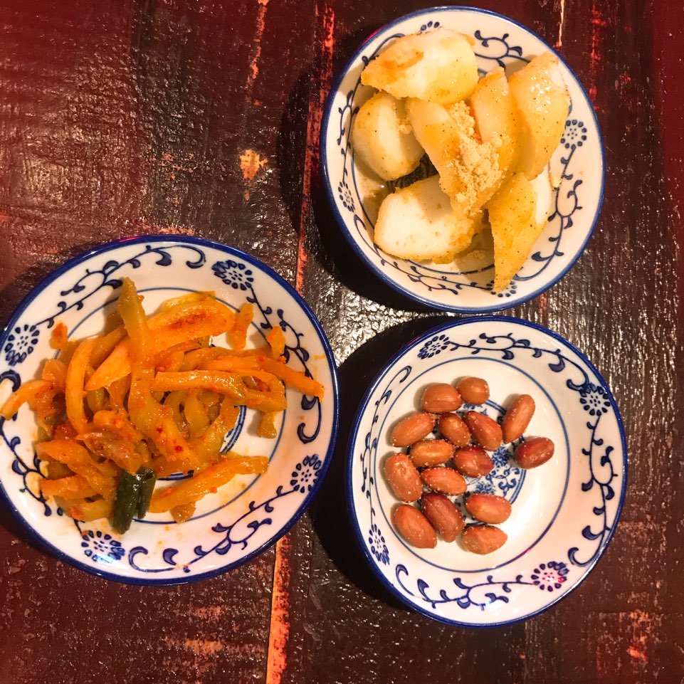 자리에 앉아있으면, 밑반찬을 주신다. 땅콩, 짜사이 무침, 꿀떡 이렇게 나온다.