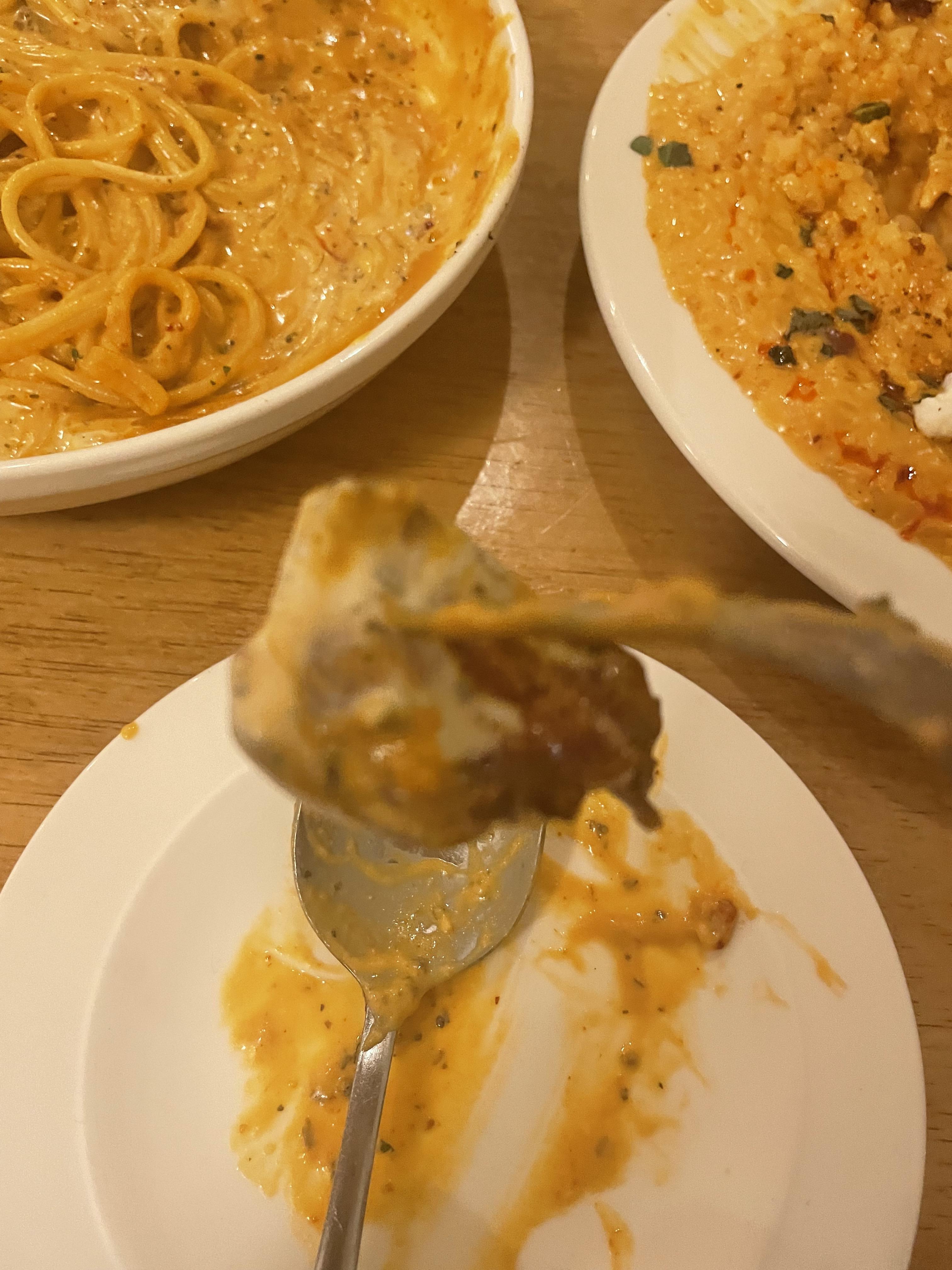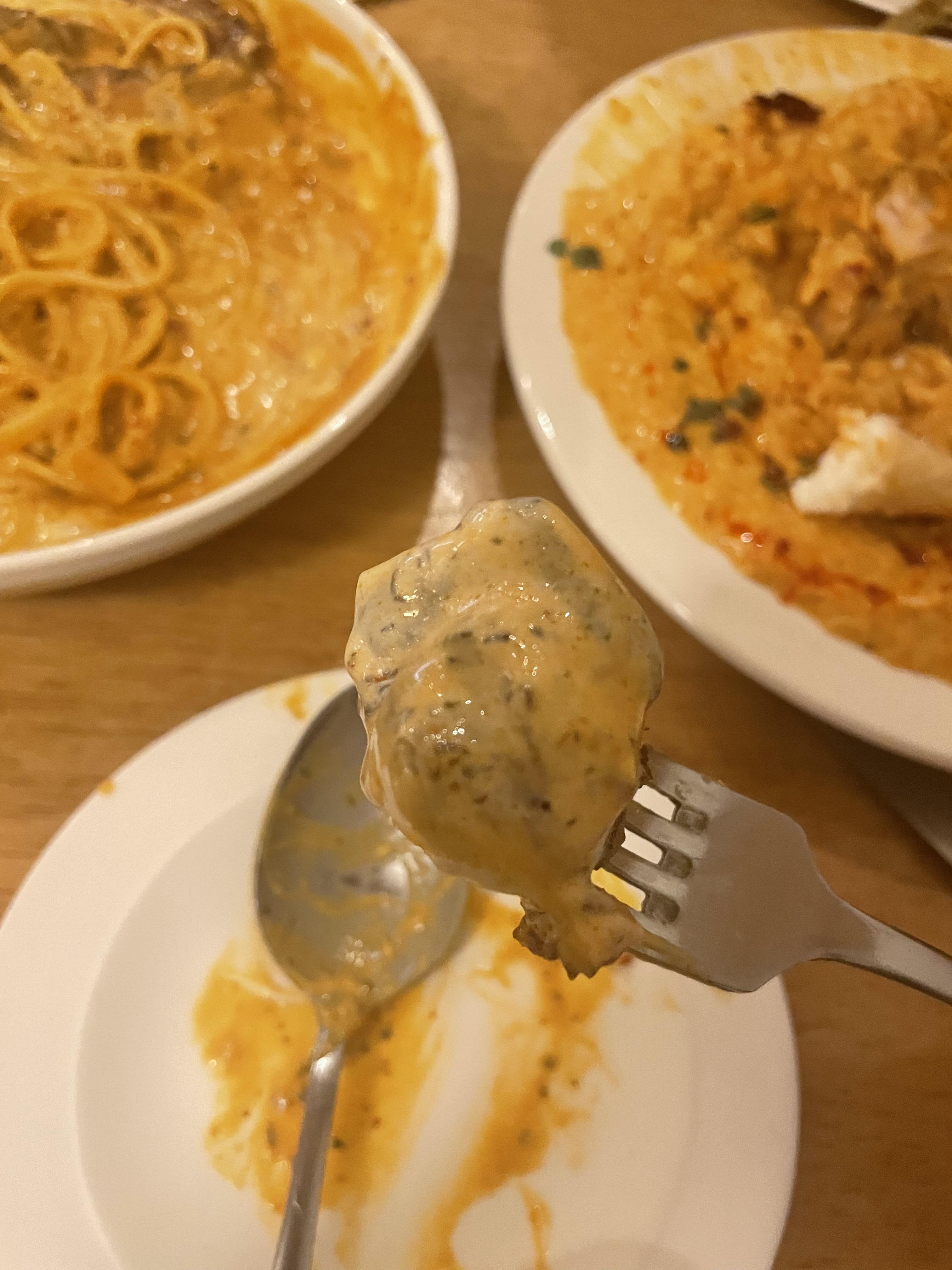 파스타를 먹었으니, 이제 대망의 고기를 집어서 먹어보았는데요?