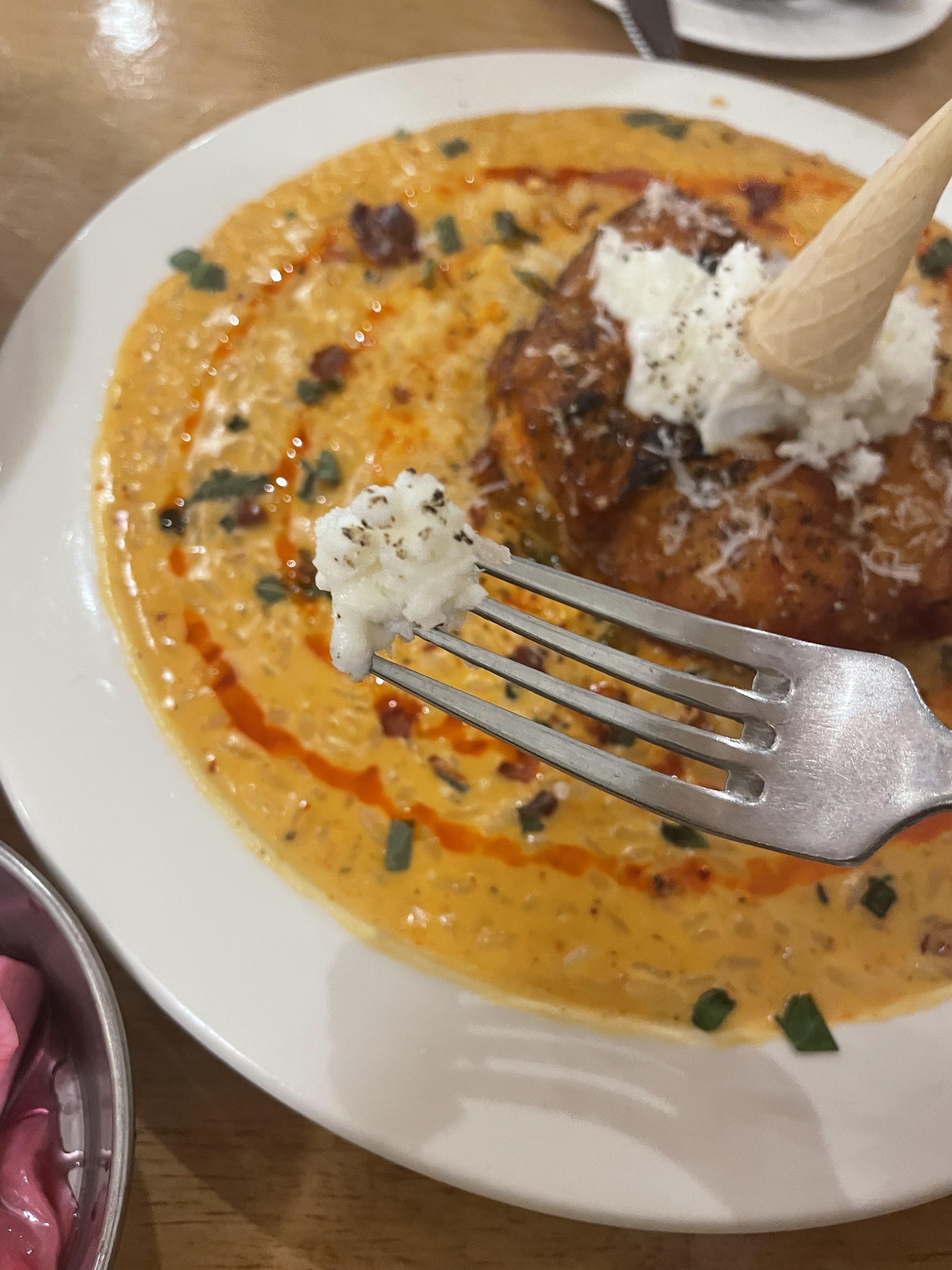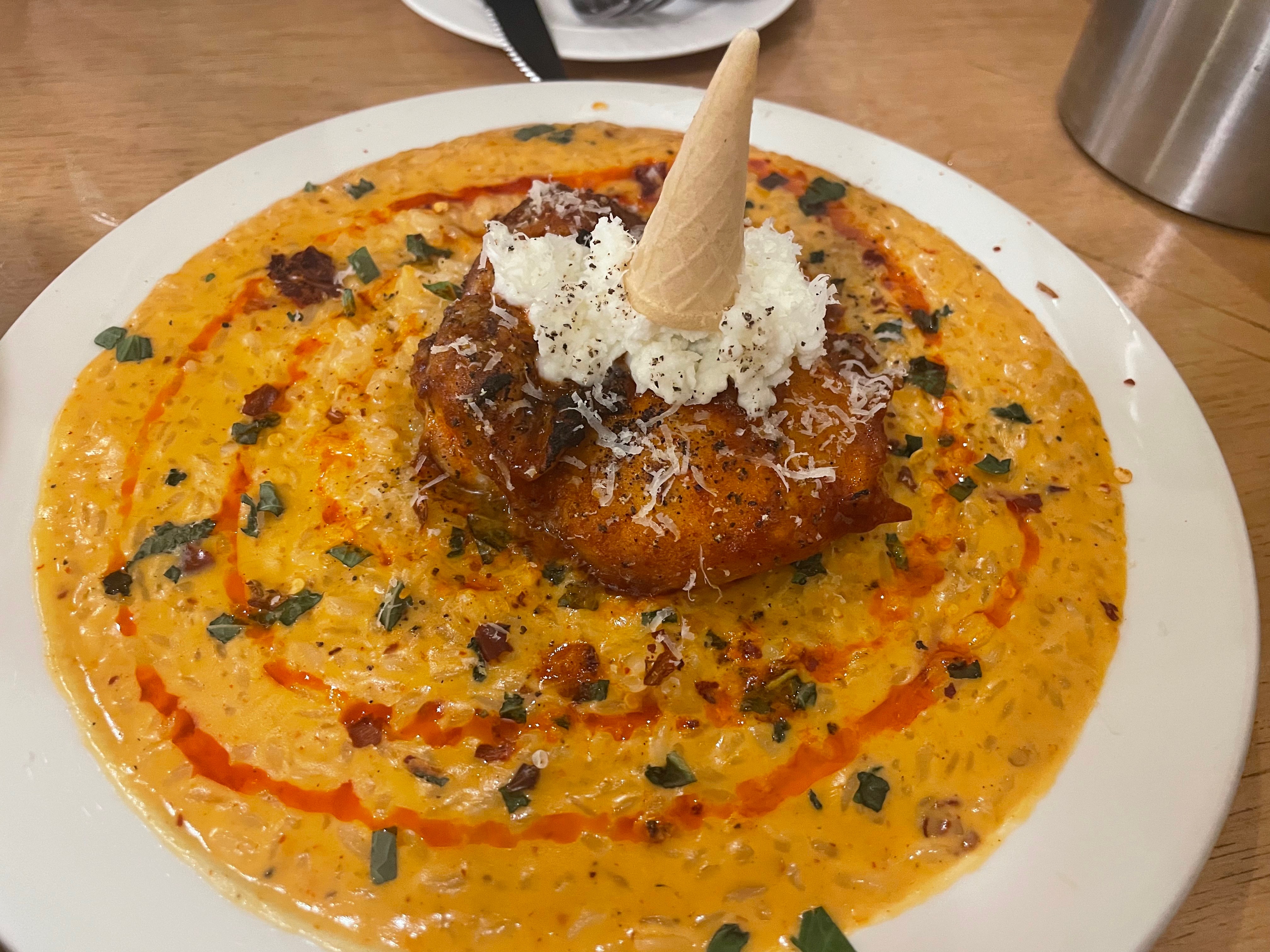 우선 매콤닭갈비 리조또입니다. 위에 아이스크림 콘이 너무 귀여워요.