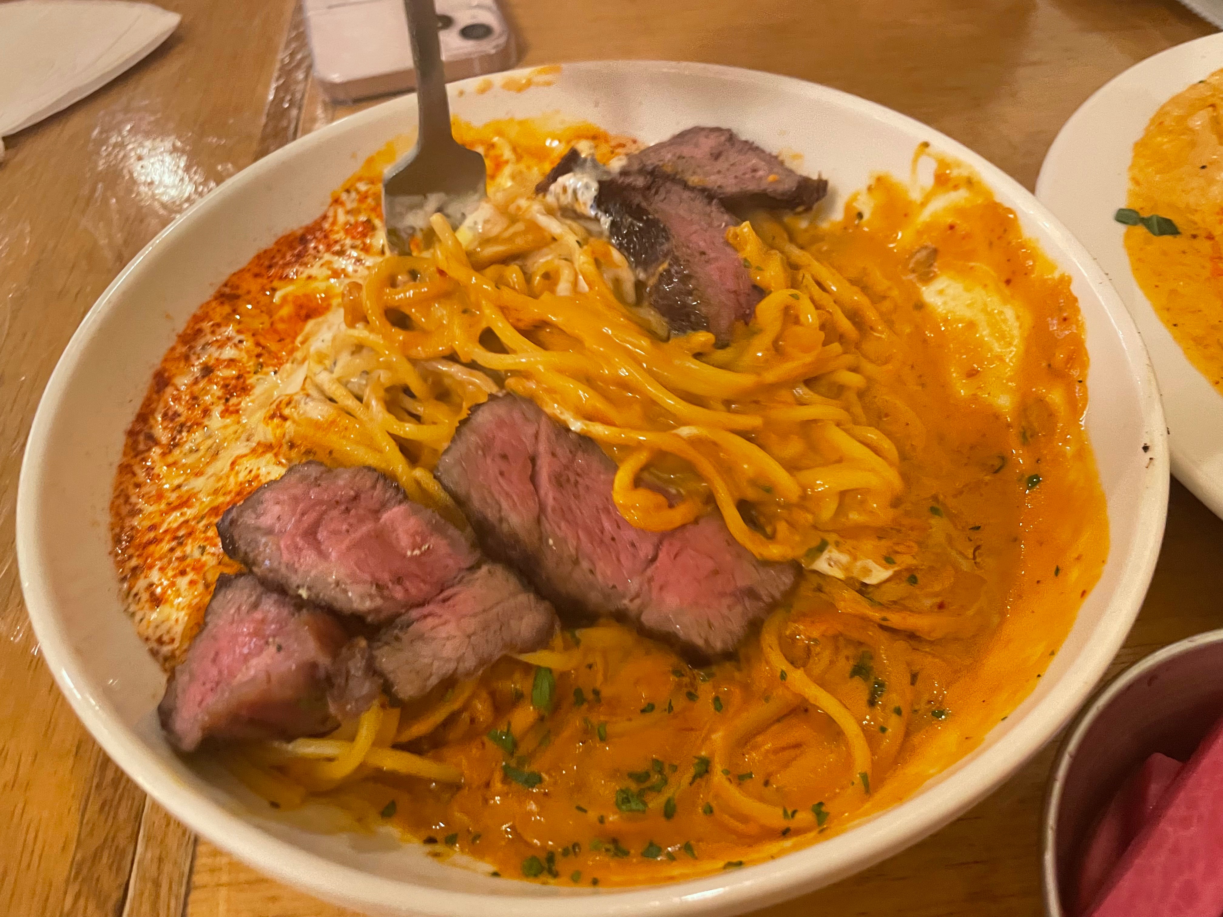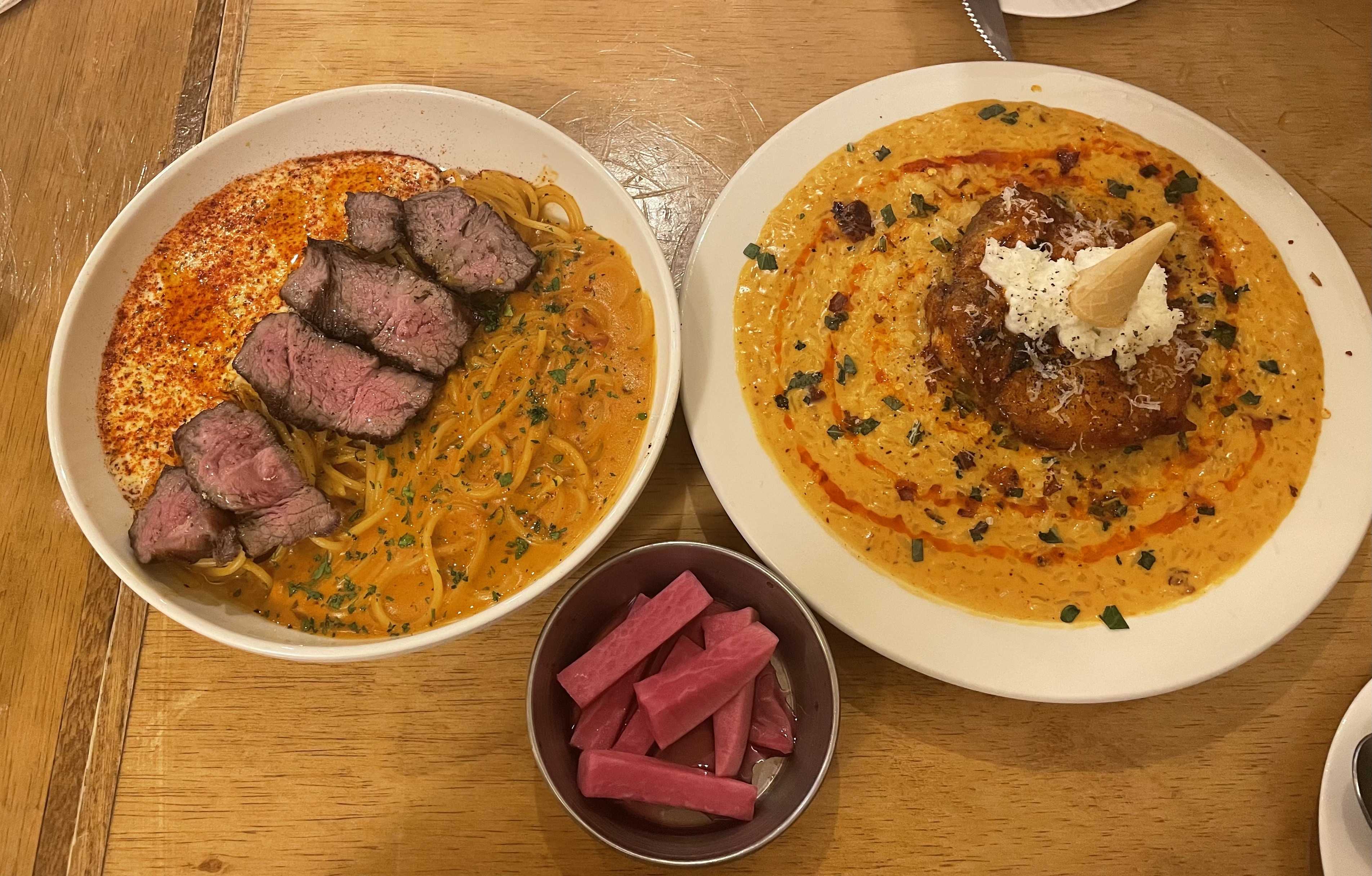 왼쪽은 로제 스테이크 크림파스타 그리고 오른쪽은 매콤 닭갈비 리조또입니다.