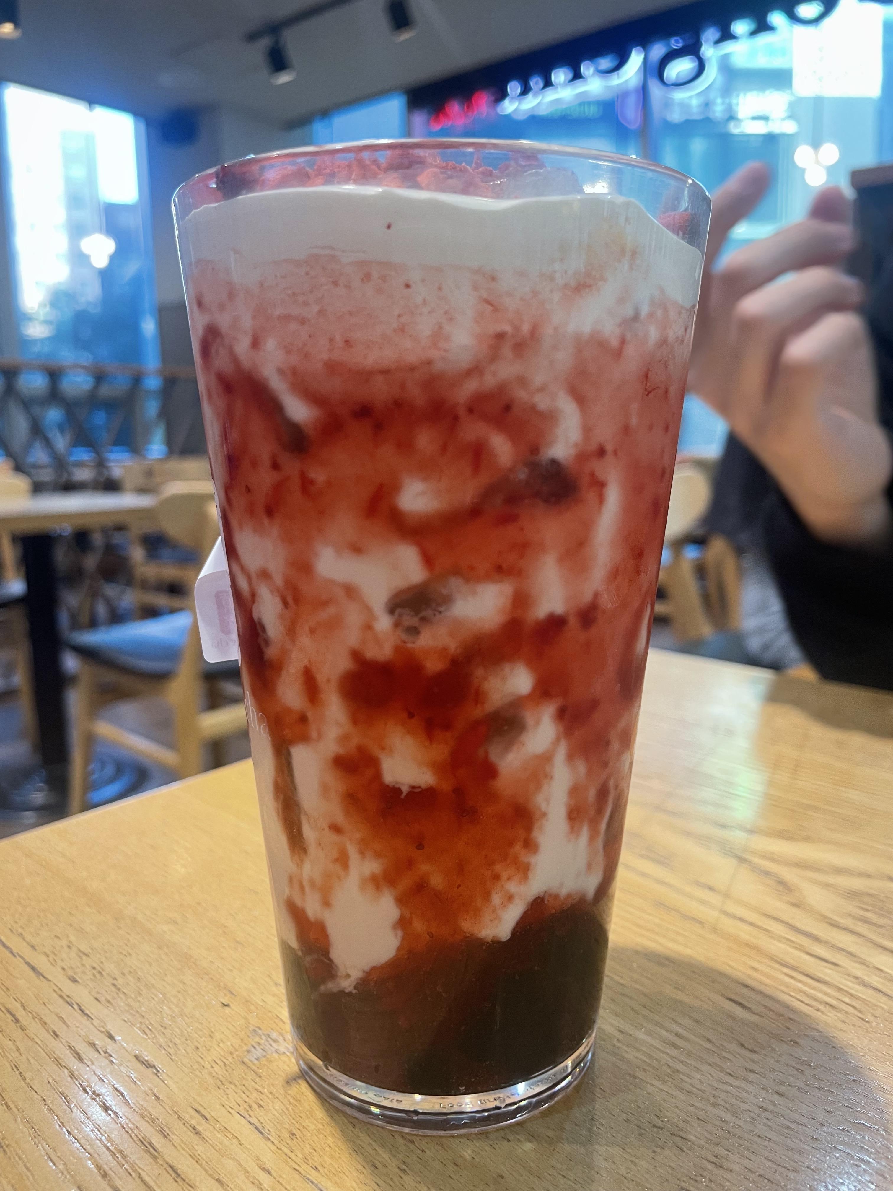맨 아래는 펄과 딸기쥬얼리 그리고 밀크티와 딸기시럽, 맨 위에는 치즈폼이 올려져있습니다.