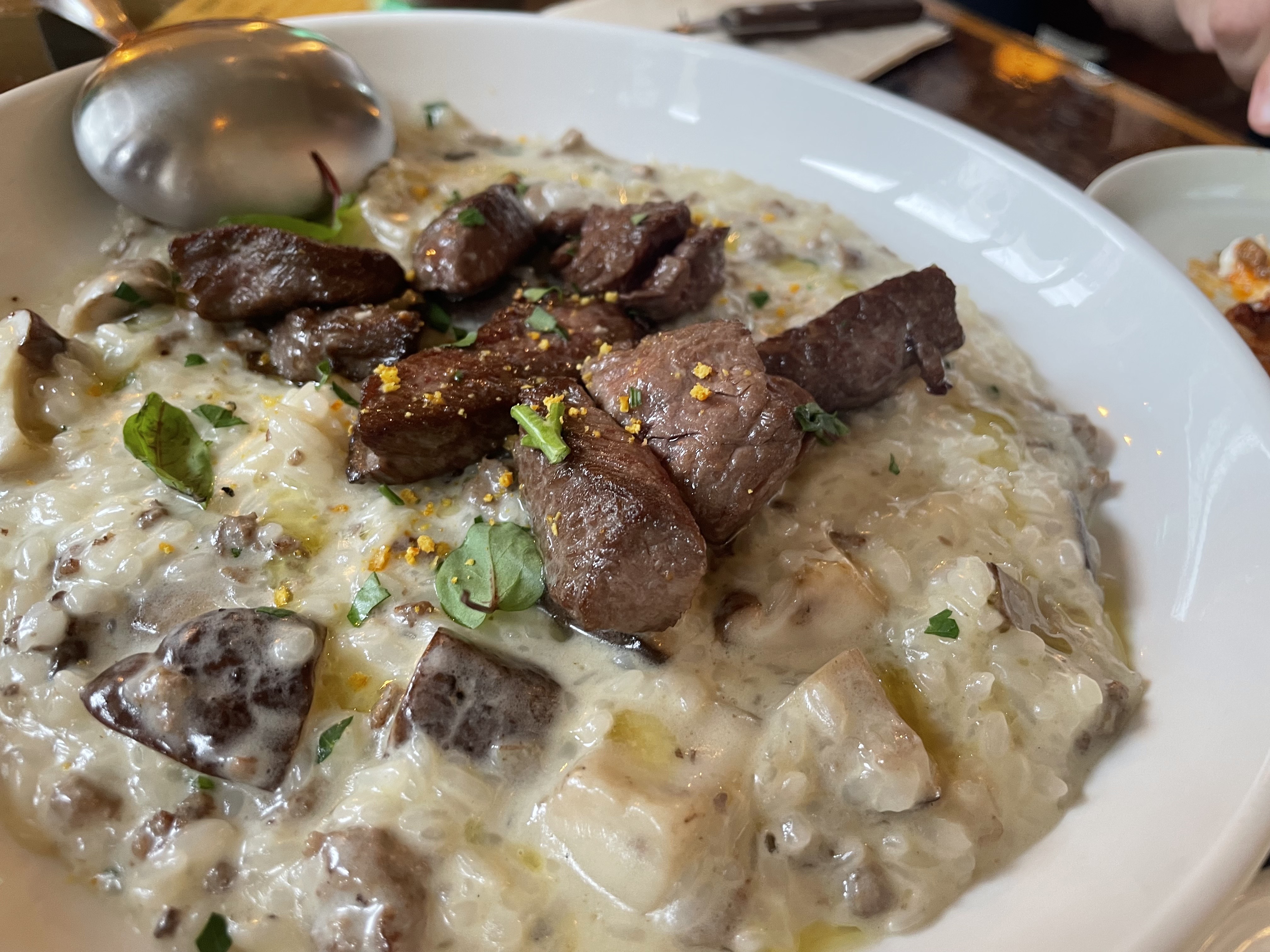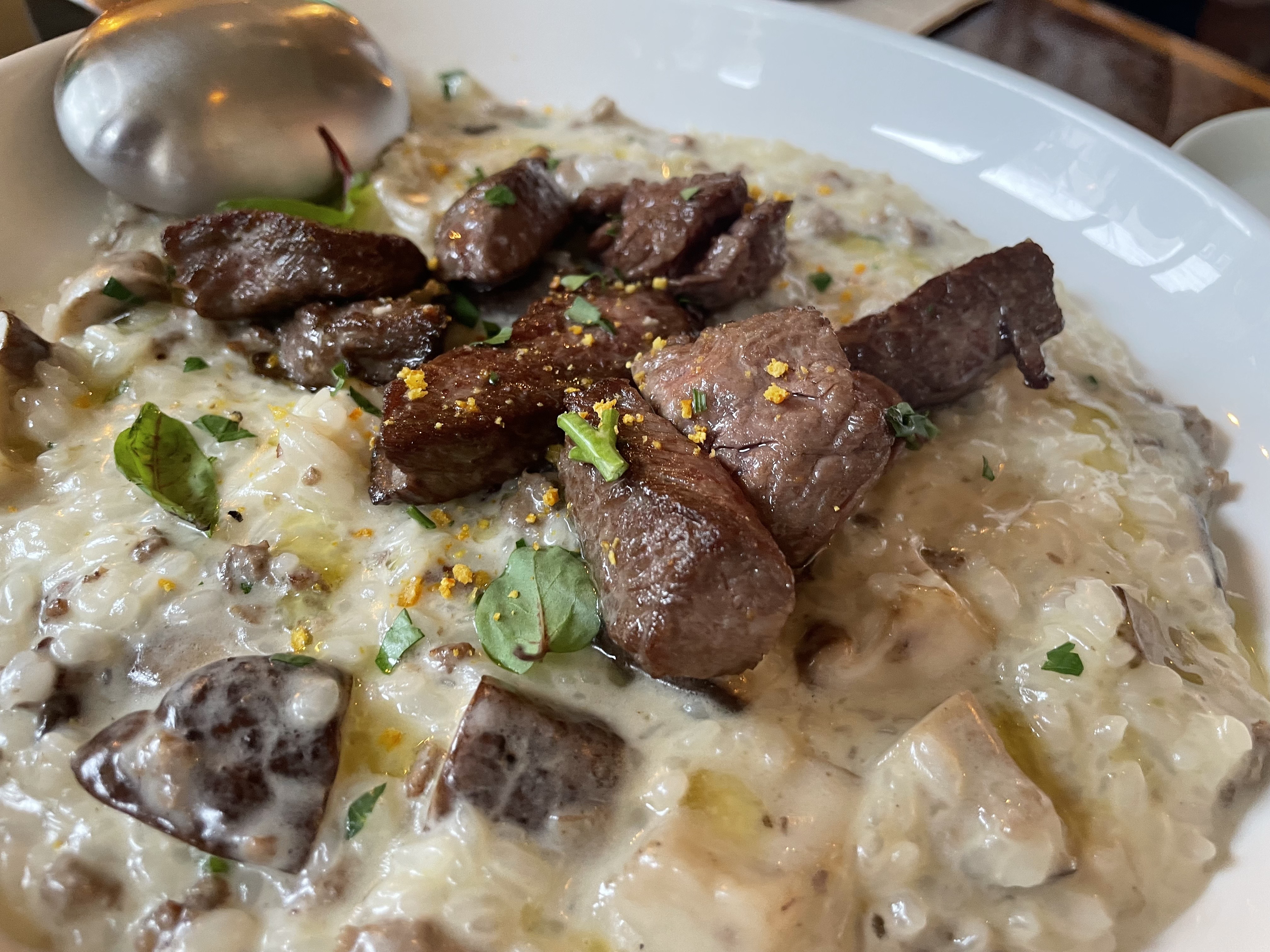 스테이크와 버섯이 힘께 있는 크림리조또였습니다.