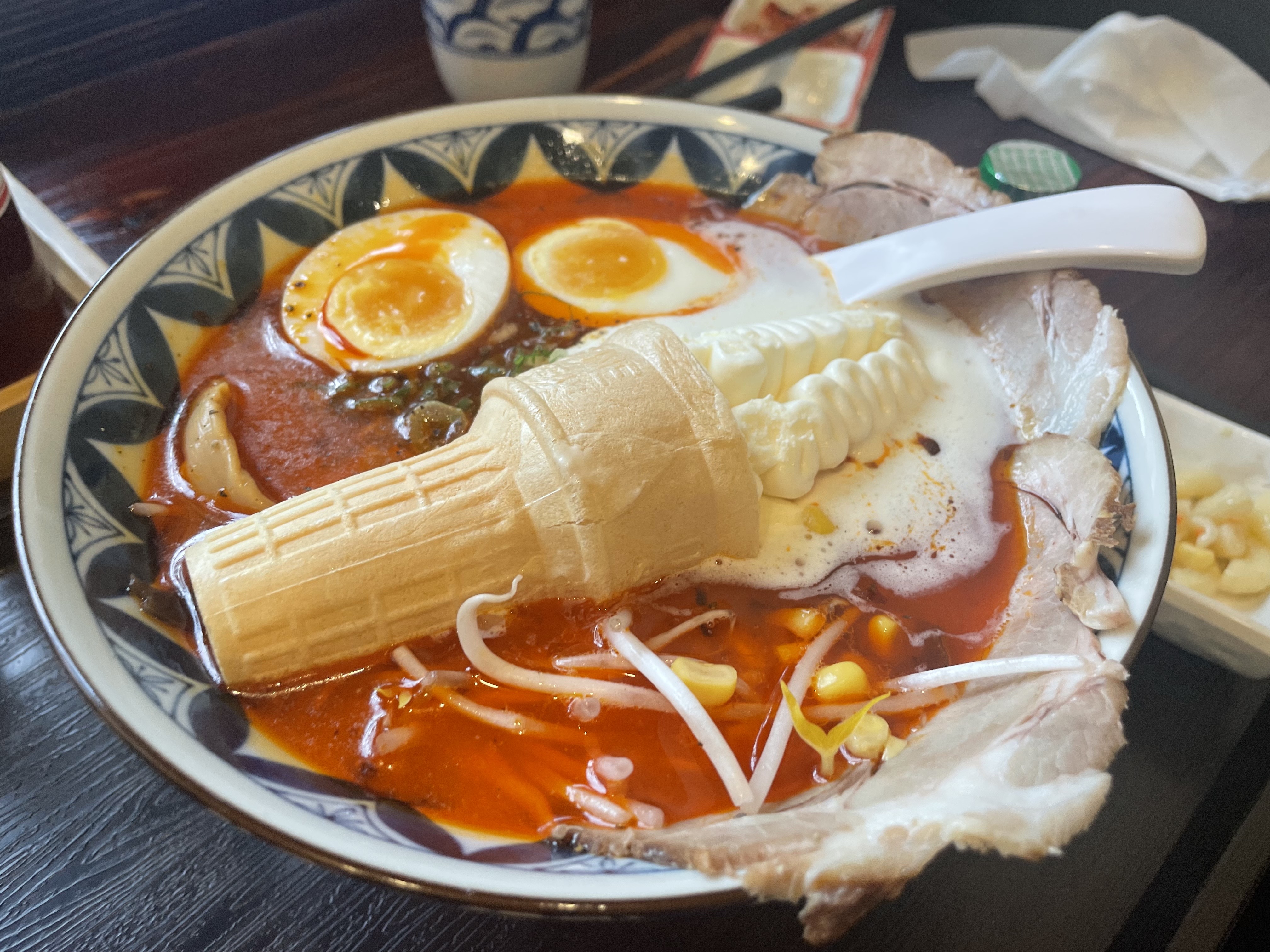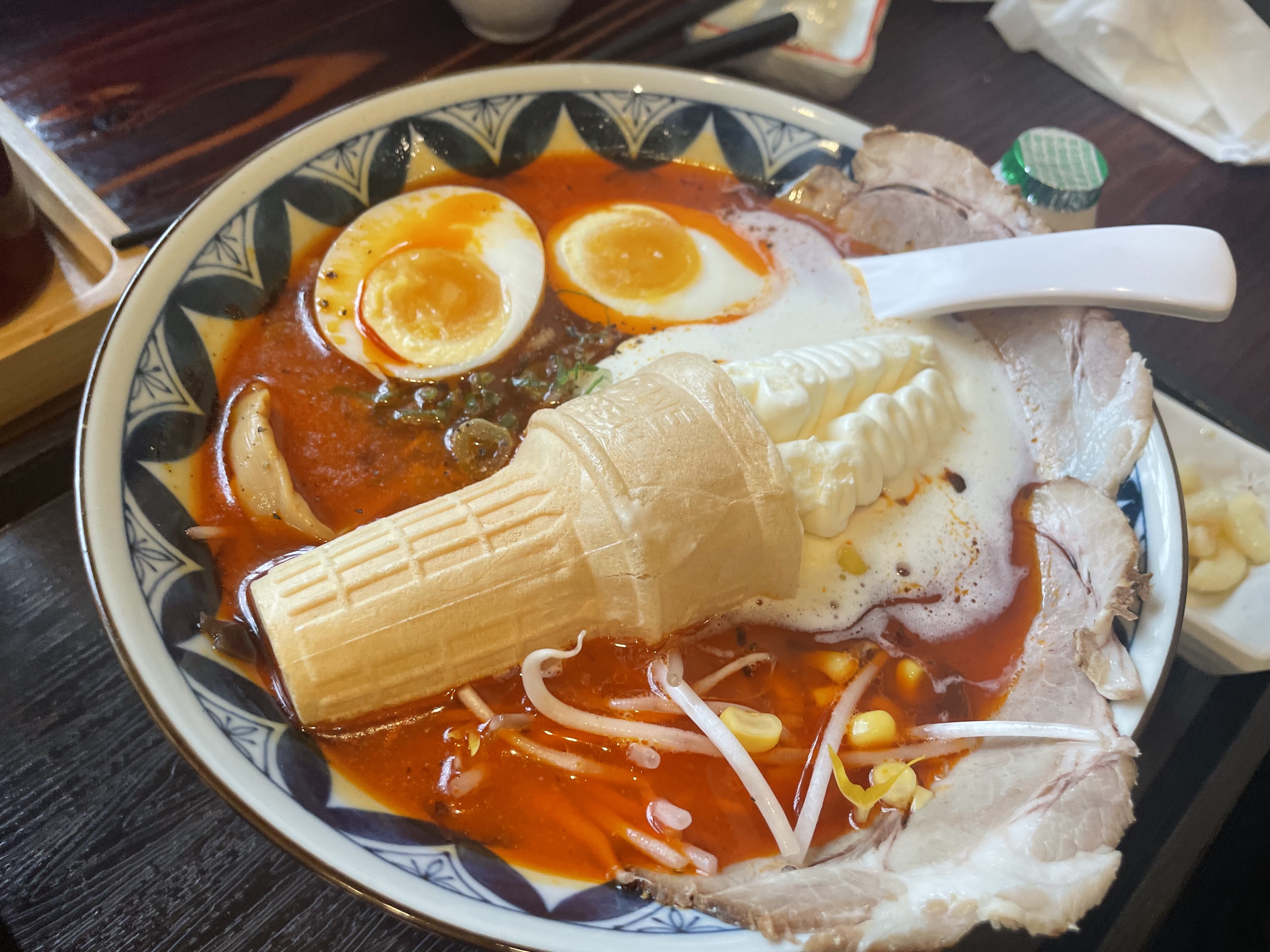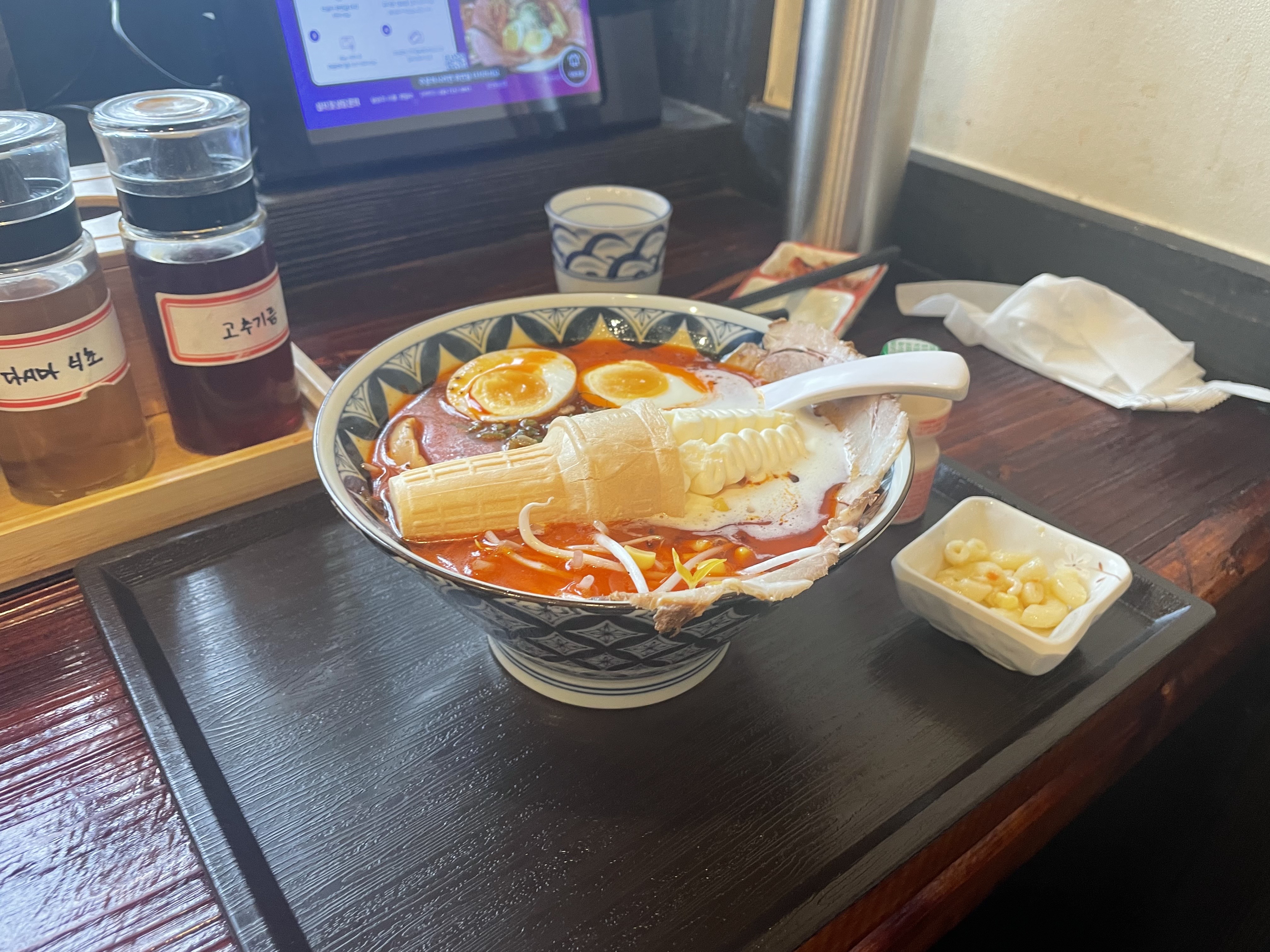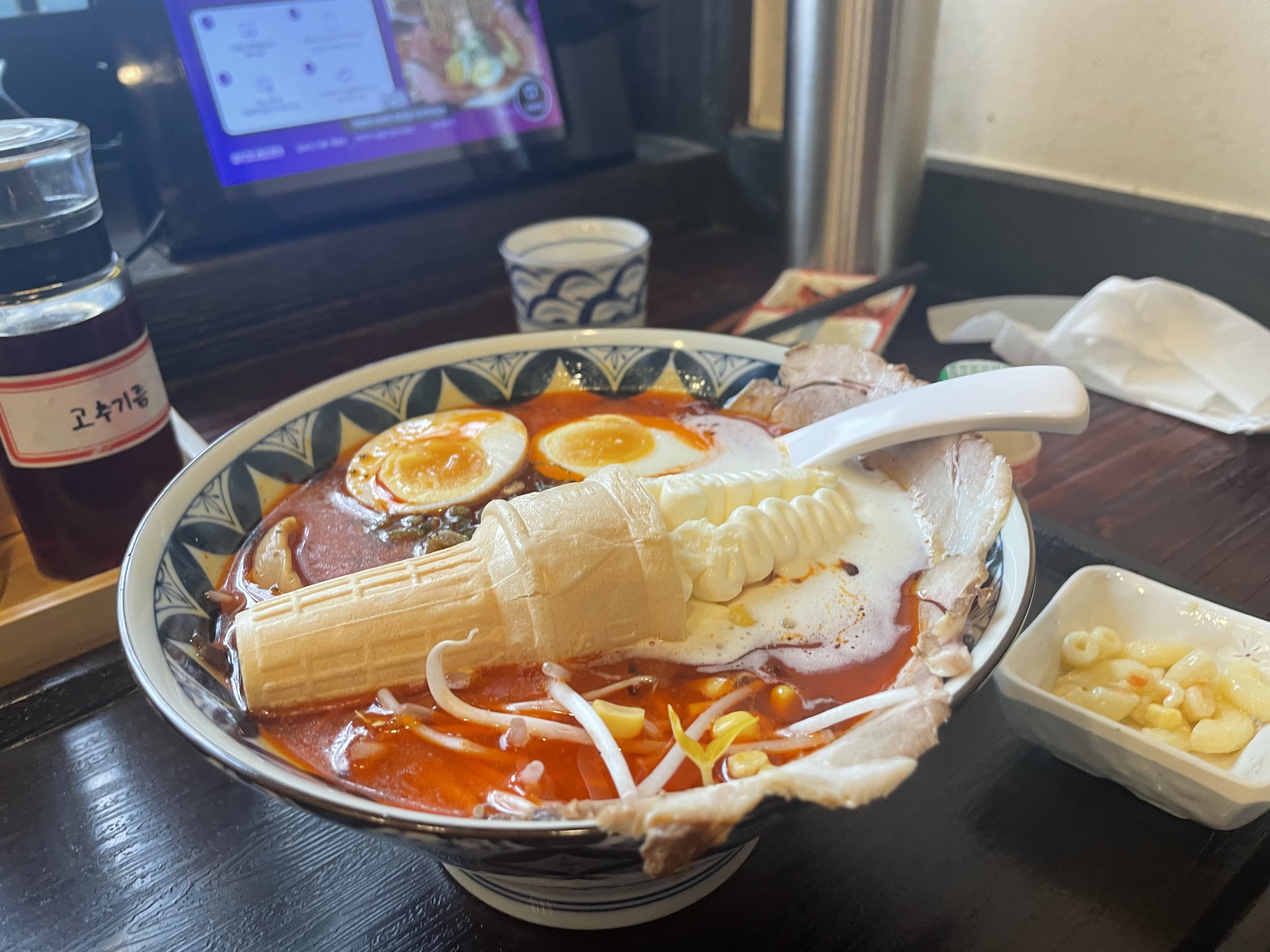 라멘 이름은 카라쿠치 돈코츠 라멘인데 여기에 빵빠레 아이스크림이 빠진거에요