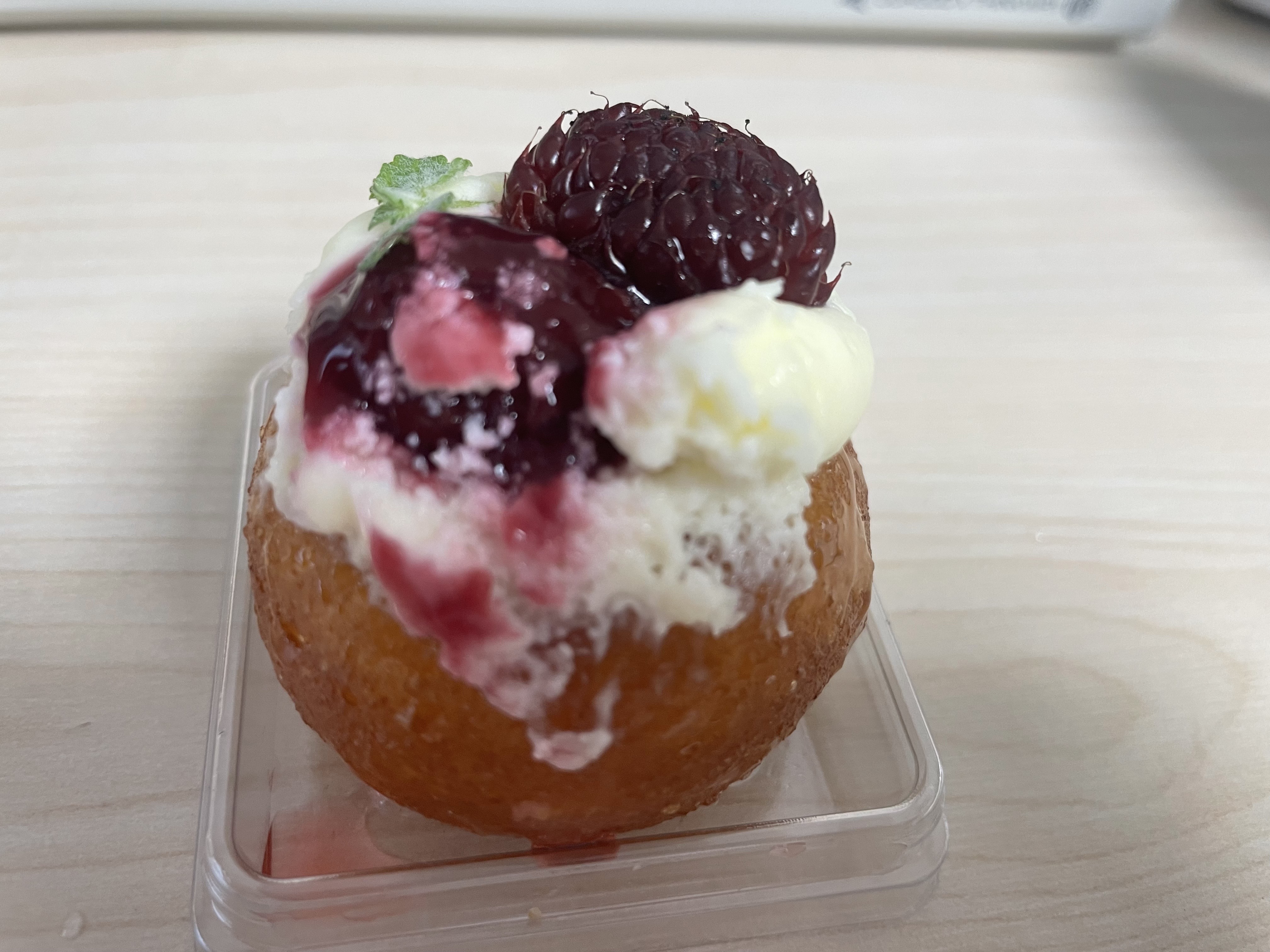 라즈베리는 2-3개 정도 올려져있고 그 아래 생크림 같은걸로 고정시켜놓은 듯 했습니다.