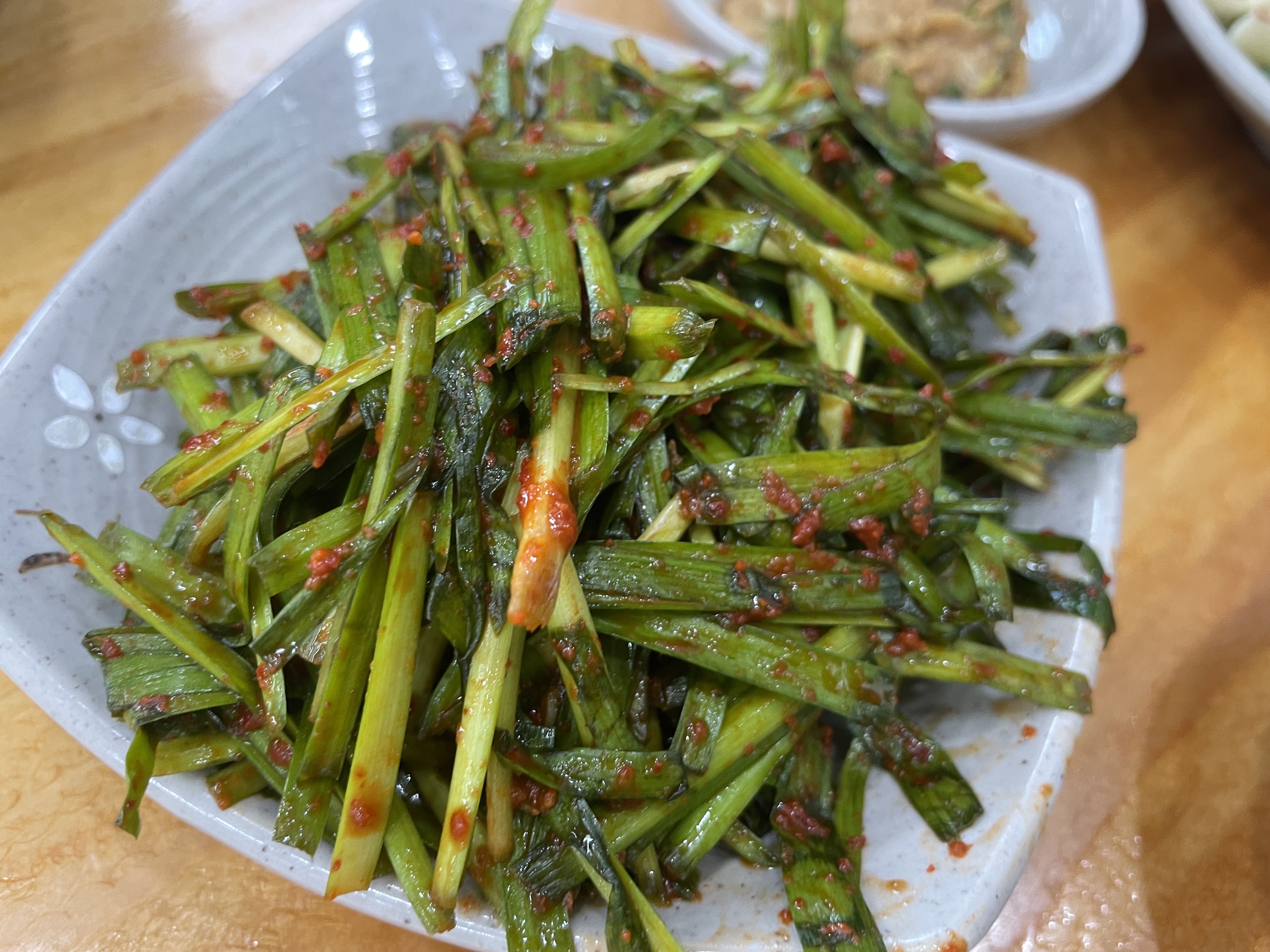 부추에 쌈장, 마늘, 양파, 고추 그리고 새우젓이 있었어요.