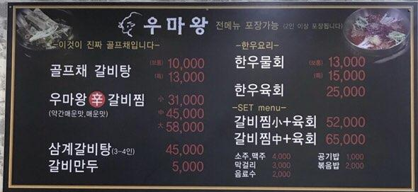 가족 4명이 가서, 한우 물회 보통 2개와 우마왕 辛 갈비찜(小)을 시켜서 먹기로 했다.